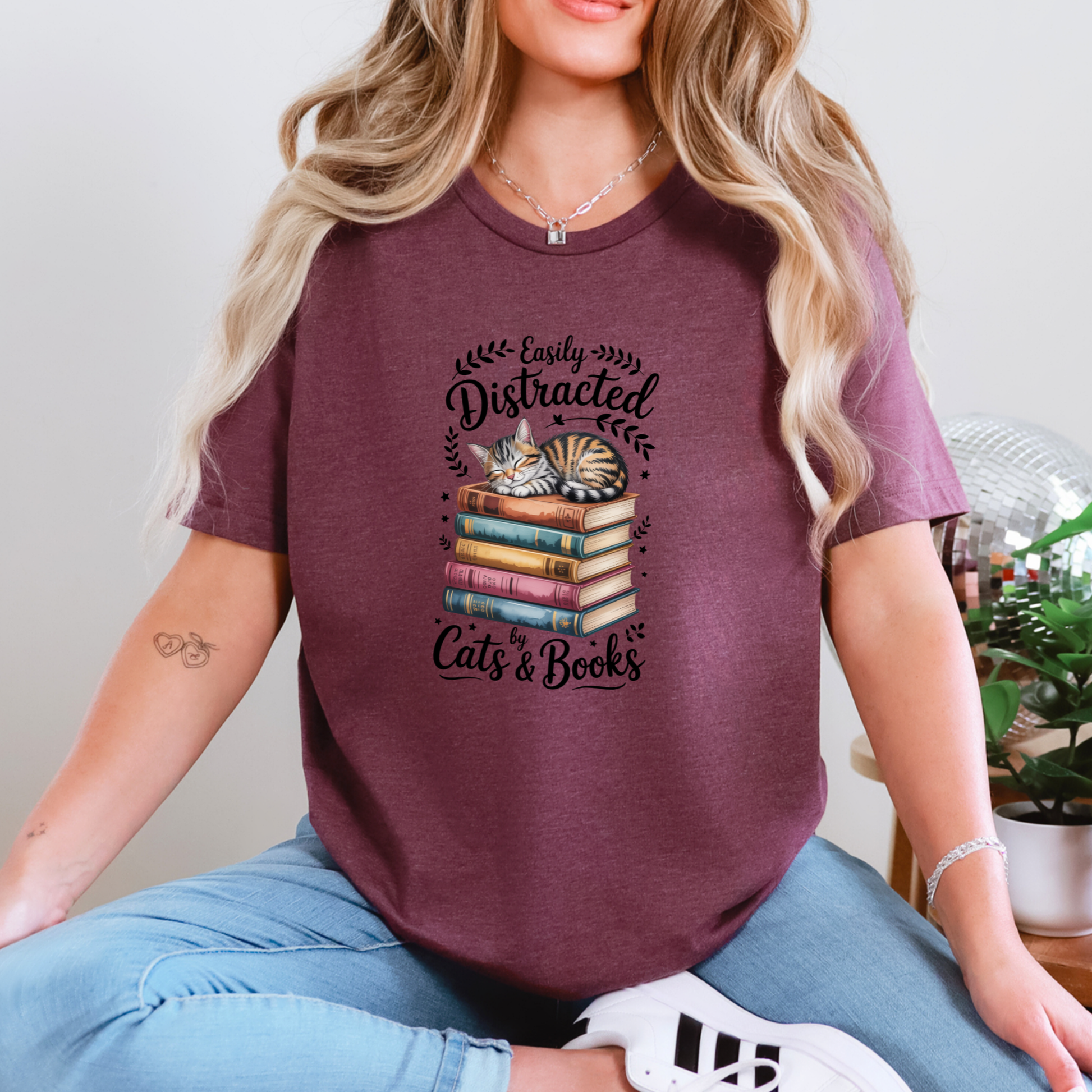 Perfect for book lovers and cat lovers alike! This “Easily Distracted by Cats & Books” tee features an adorable kitty curled up on a stack of classics. Soft, comfortable, and irresistibly cute—wear it for cozy reading days, lounging at home, or gifting to your favorite bibliophile.